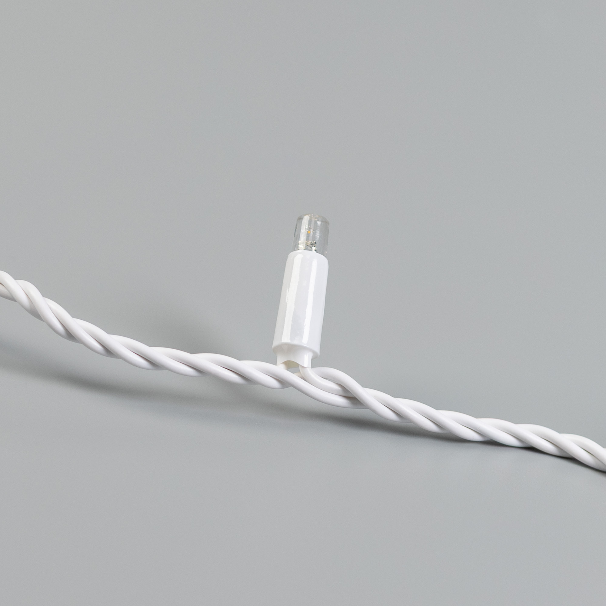 Универсальная светодиодная гирлянда "НИТЬ" серии Classic, предназначенная для декорирования и создания праздничного настроения как внутри помещений, так и снаружи (степень пылевлагозащиты IP65 позволяет размещать гирлянду на улице под навесом). Имея длину 10000 мм, она может использоваться для оформления средних и больших площадей. Универсальные соединительные разъемы позволяют наращивать длину до 50 м без использования дополнительных аксессуаров. Прозрачная вогнутая линза и эффект медленного мерцания каждого светодиода обеспечивают яркое, динамичное освещение, выделяя украшаемые объекты. Холодный белый свет помогает создать необходимую атмосферу для декоративного объекта. Провод изготовлен из ПВХ и окрашен в белый цвет. Аксессуары для подключения гирлянды к сети и управления приобретаются отдельно