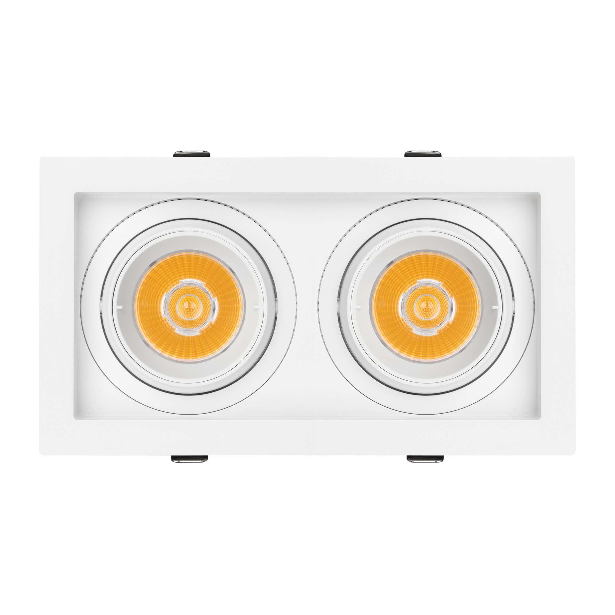 Встраиваемый карданный светильник. Мощность 2х20 Вт, св. поток 4134 лм, 103 лм/Вт, дневной 4000 K, CRI>92, угол 20°, напряжение питания 230 В. Белый корпус из алюминия, черная вставка, степень защиты IP20. Размер: длина 210 мм, ширина 117 мм, высота 105 мм. Монтаж встраиваемый, установочное отверстие: длина 190 мм, ширина 95 мм. Драйвер 24-42 В, 500 мА, пульсация <2%.