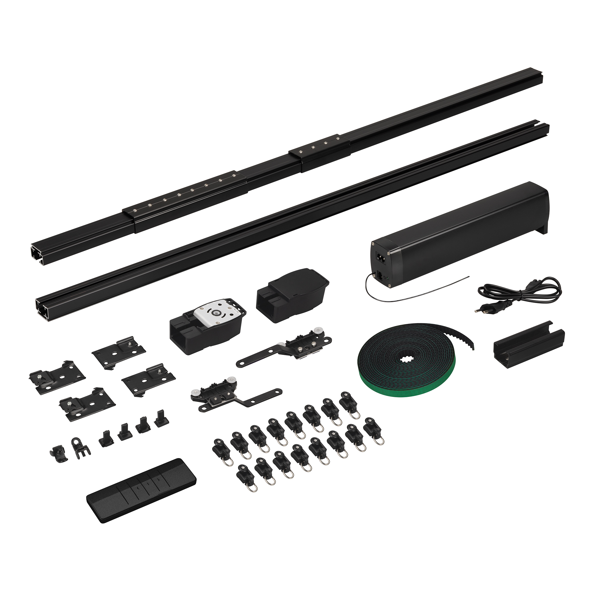 Комплект электрокарниза в черном цвете длиной до 2м (регулируется наборными частями) для раздвижных штор, состоящий из мотора, наборного алюминиевого трека, пульта и комплектующих. Электропривод с питанием 100-240В, мощность 45Вт, момент 1.2Нм, вес штор до 40кг. Управление с помощью пульта из комплекта, по WI-FI, 2.4ГГц, Bluetooth, "сухими" контактами на входе RJ45. Совместим с платформой TUYA, АЛИСА от ЯНДЕКС. Управление со смартфона через приложение SmartLife, с помощью пульта в комплекте. Ремень из комплекта находится на дне коробки. 1 мотор, 1 пульт дистанционного управления, алюминиевый профиль 1,6 мм (1м - 1шт, 0.5м - 1шт, 0.2м - 2шт., 0.1м - 1 шт.), 2 соединителя 10 см, 1 соединитель 20 см, 1 переходник 5 см, 2 шкива, 2 пряжки ремня, 2 направляющих бегунка, ремень 4,4 м, 16 бегунков, 2 фиксатора, 4 кронштейна, 1 зажим на ремень