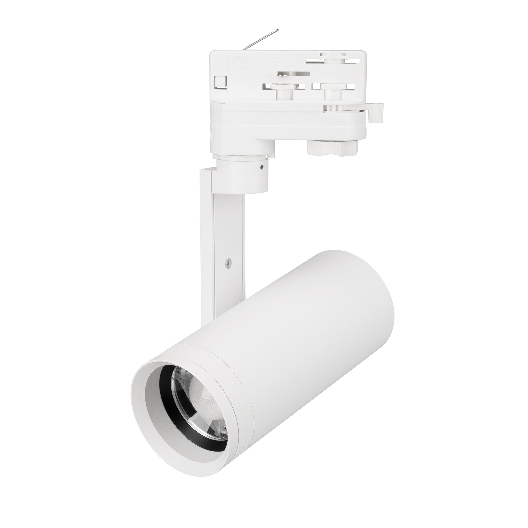 Светильник для треков/шин 4 провода, 10 Вт. Цвет свечения меняется в диапазоне 2700K/3000K/3500K/4000K/5700K (при помощи переключателя на корпусе), световой поток 560-830лм, регулируемый угол 20-50°, CRI>90. Корпус круглый, алюминий, цвет белый, IP20. Угол наклона корпуса 90°, угол поворота корпуса 330°. Габариты LxWxH: 83х65x245мм. Размер светового модуля DxL: 65x150мм. Входное напряжение AC220-240V, мощность 10Вт. Драйвер встроенный 30-40V, 230мА, 10Вт.