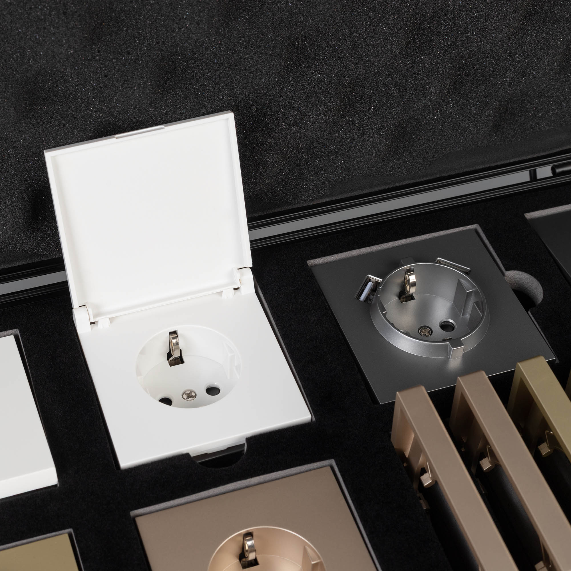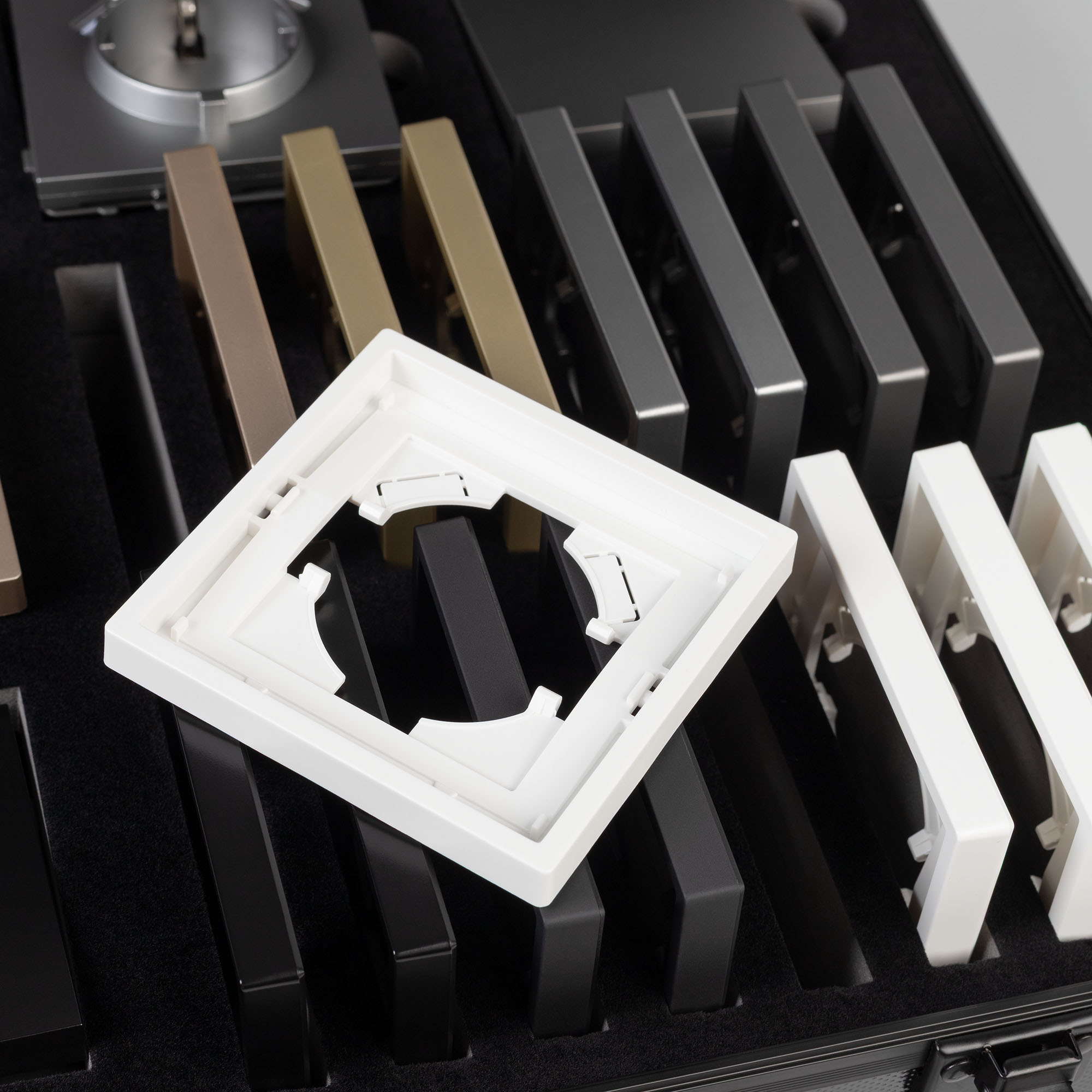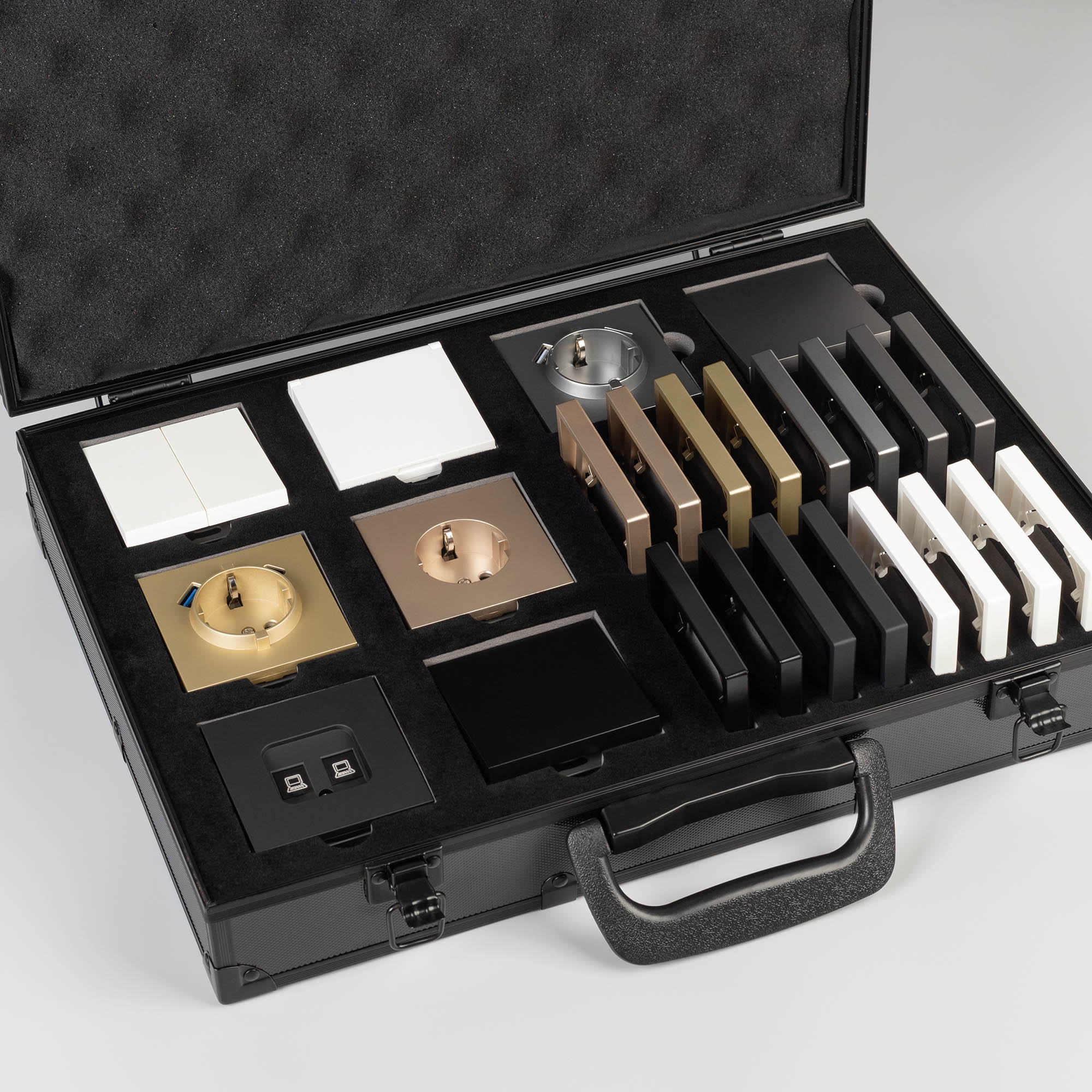 Демо-кейс с наполнением электроустановочных изделий серии TENDO. Демо-кейс содержит: Рамки серии TENDO в цветах белый, черный, золотой и серебристый (серый). Поверхность рамок имеет матовое и Soft-Touch покрытие; Механизм компьютерной розетки (двойной) в черном цвете - арт.054595 Механизм розетки с дополнительными USB Type A + Type A выходами в серебристом(сером) цвете - арт.054084 Механизм выключателя на две клавиши (проходной) в белом цвете - арт.054556. Механизм розетки под евровилку в золотом цвете - арт. 054081 Механизм USB розетки в золотом цвете - арт. 054537 Механизм звонкового выключателя в серебристом(сером) цвете - арт. 054589 Механизм выключателя на одну клавишу (перекрестный) в черном цвете - арт. 054055 Механизм розетки влагозащищенный в белом цвете - арт. 054090 Рамки представленной серии накладного типа монтажа - не требуют дополнительного оборудования для установки рамки на механизме.