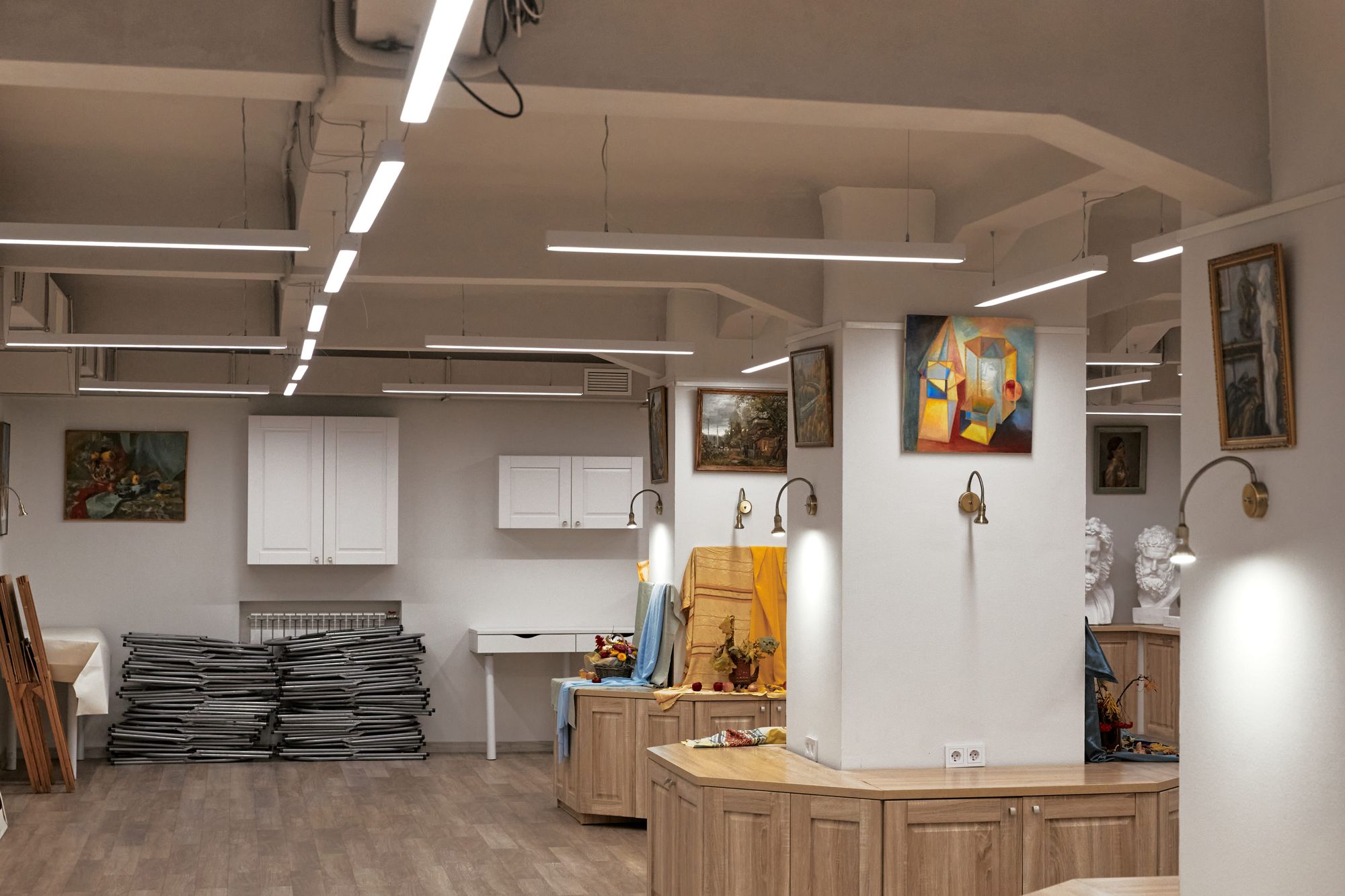 Несмотря на то, что под крышей Дворца культуры железнодорожников расположились самые разные пространства — детский центр, библиотека, танцевальная студия, Народная студия изобразительных искусств им. Ю. К. Киселева и Народный театр драмы им. Г. Е. Гецова, — во всех них был создан единый стиль освещения.