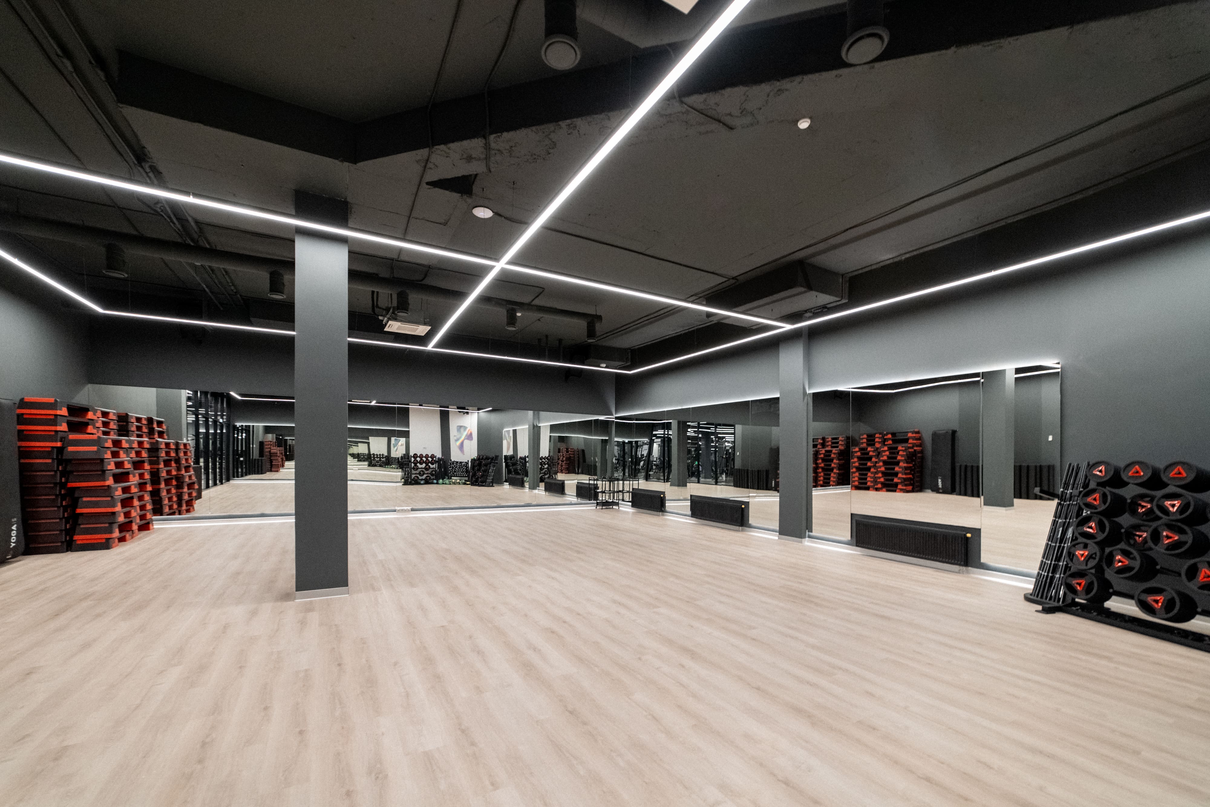 В большинстве помещений фитнес-центра на потолках можно увидеть открытые коммуникации: подвесные линии света не только легко устанавливаются в данных условиях, но и перетягивают на себя внимание от несовершенств потолков.