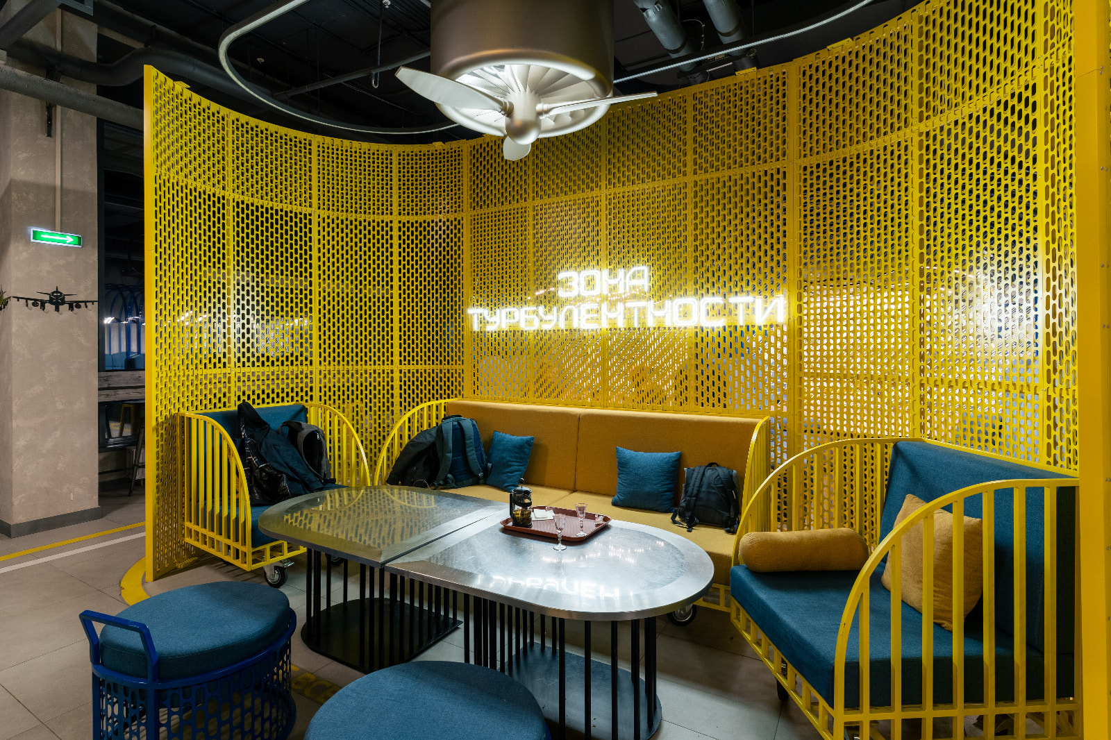 В аэропортах всегда царит особая атмосфера — время здесь замирает, несмотря на поток вечно спешащих пассажиров. Интерьер фудкорта в ТЦ «Сигма» вдохновлен романтикой воздушных портов и авиации. Каждая деталь здесь тщательно продумана: разметка на полу имитирует взлетные полосы, ресторанчики отмечены табло с номером выхода на посадку, альковы оформлены под салон самолета, а настенная графика изображает вид из иллюминатора.