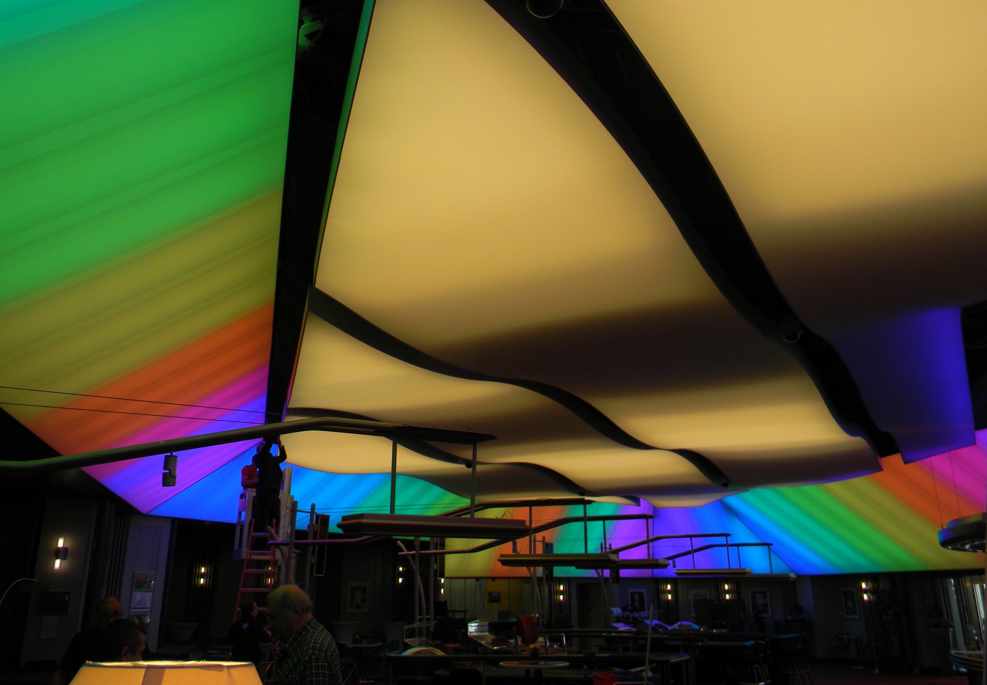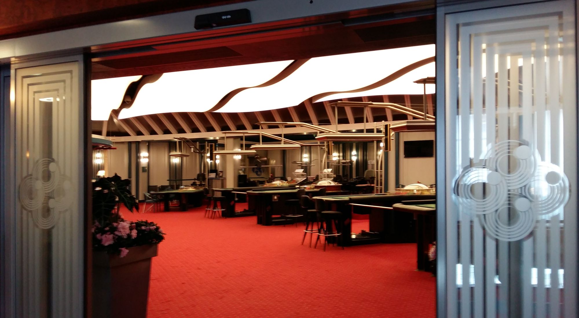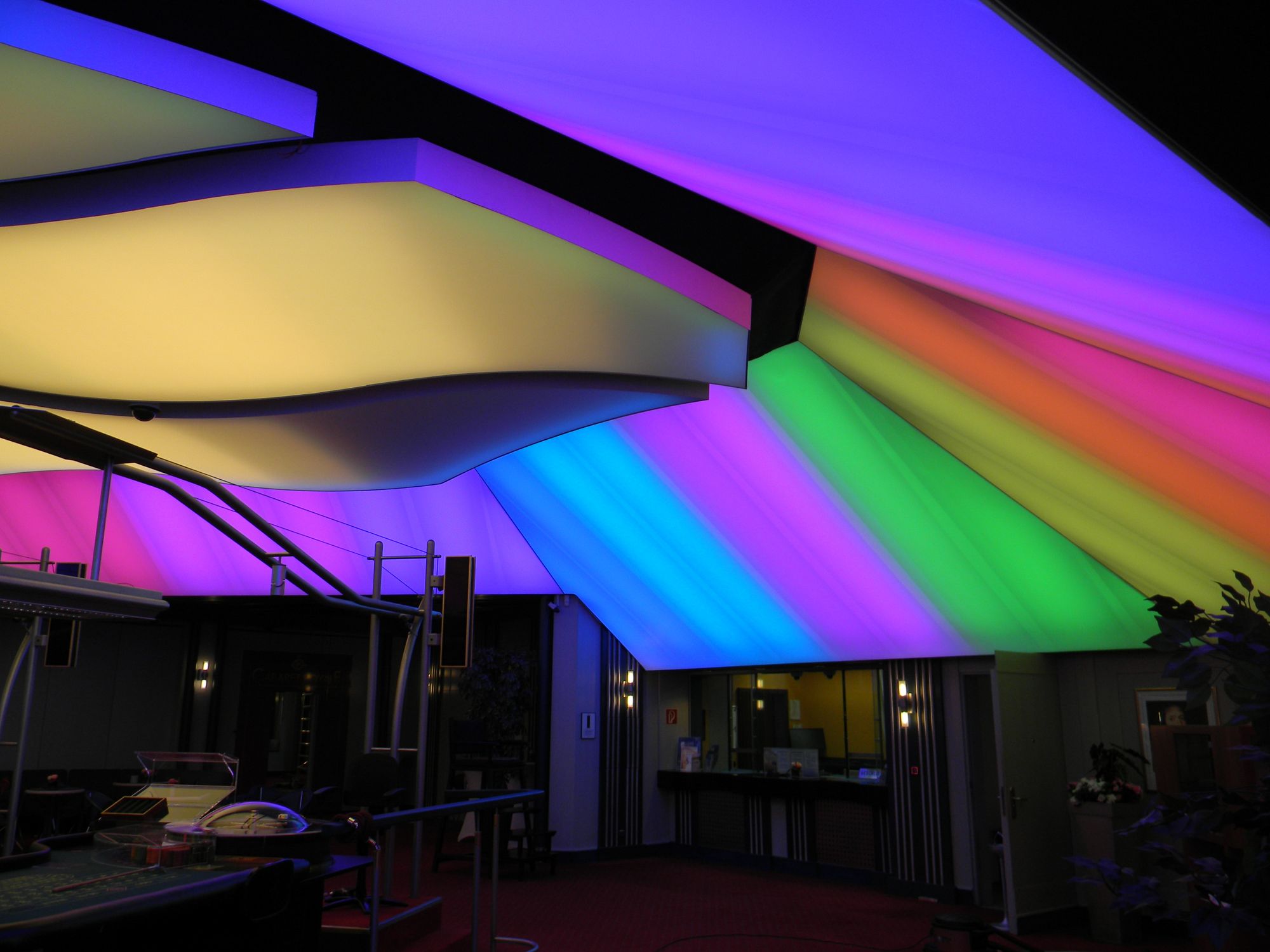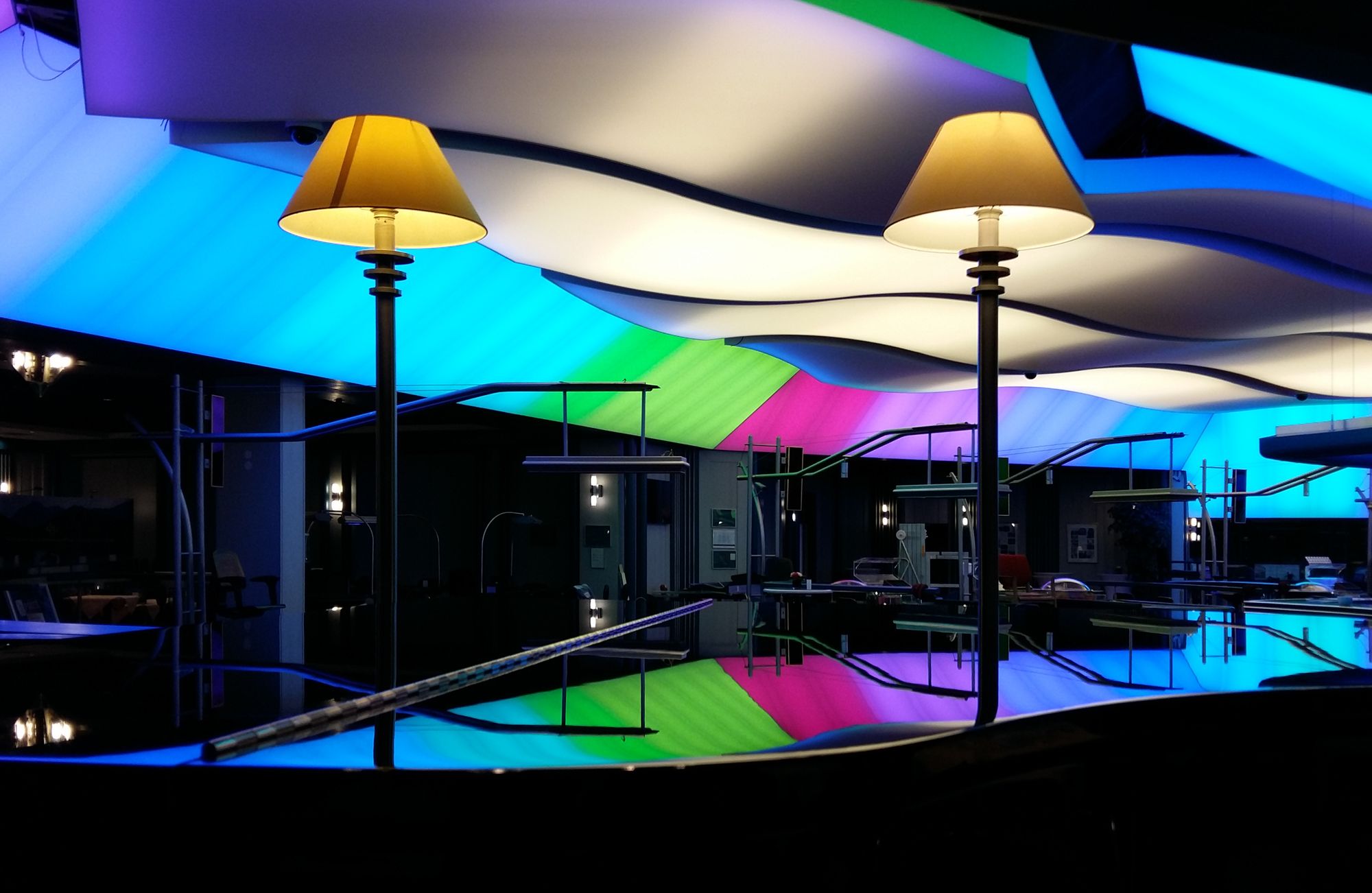 Эксклюзивный проект освещения разработан по индивидуальному проекту. В центре композиции — гигантские потолочные конструкции, представляющие собой лайтбоксы в форме волн шириной 3 м и длиной 8–15 м. Периметр игрового зала оформлен светодиодными RGB-лентами с цветодинамическими эффектами, которые можно менять с помощью сенсорной панели. Пространство казино становится удивительным местом, где свет способен играть разными оттенками, поддерживая общий игровой настрой посетителей.