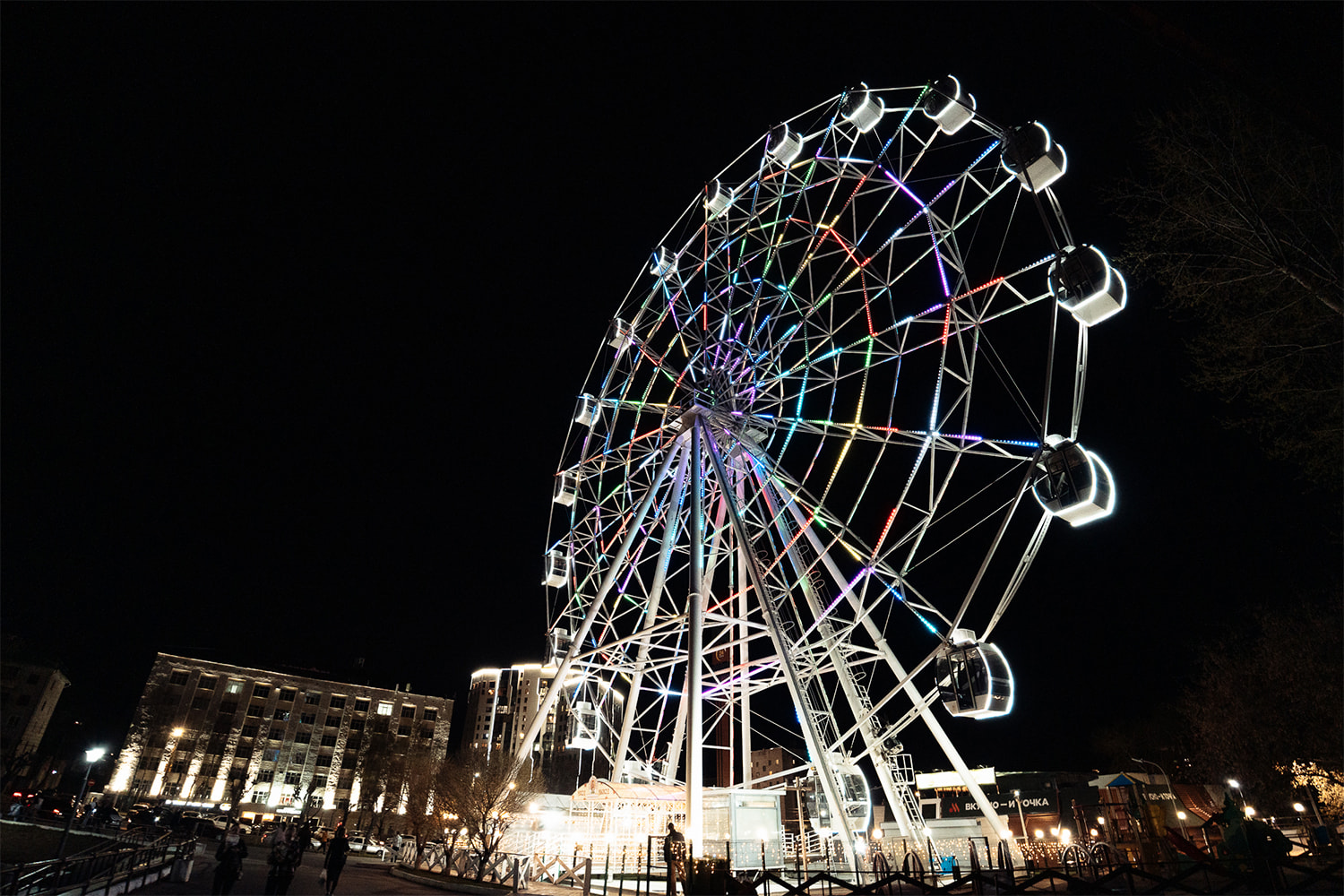 С наступлением сумерек колесо обозрения заливается разноцветной подсветкой, выполненной на основе 3600 управляемых RGB-модулей. Оригинальные динамические эффекты оживляют аттракцион, каждое мгновение создавая новый облик. Благодаря наивысшей степени пылевлагозащиты (IP68) и широкому диапазону рабочих температур модули выдерживают самые неблагоприятные погодные условия.