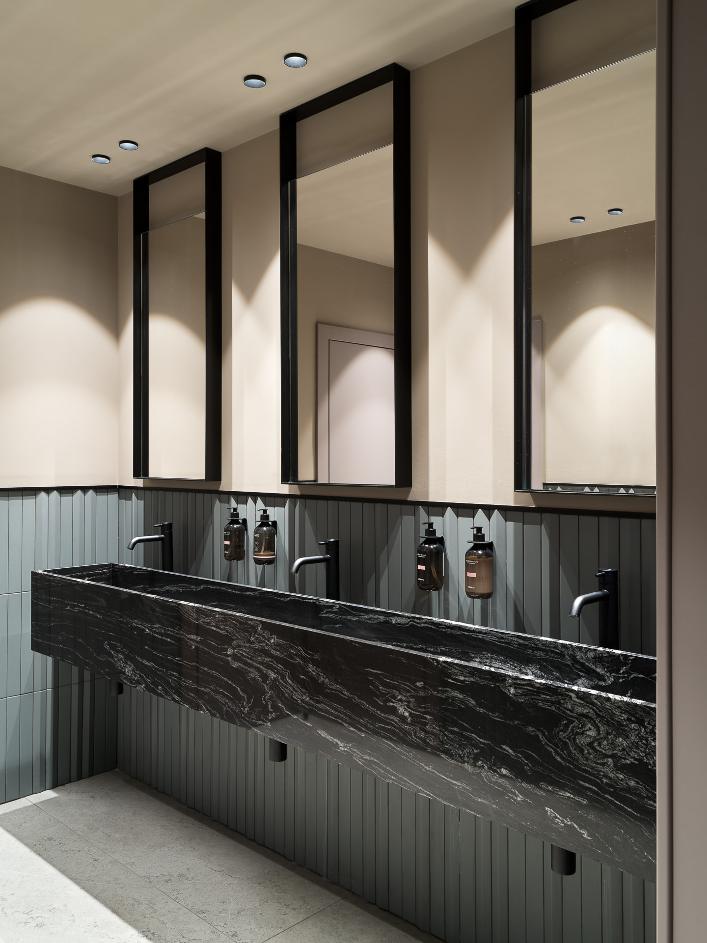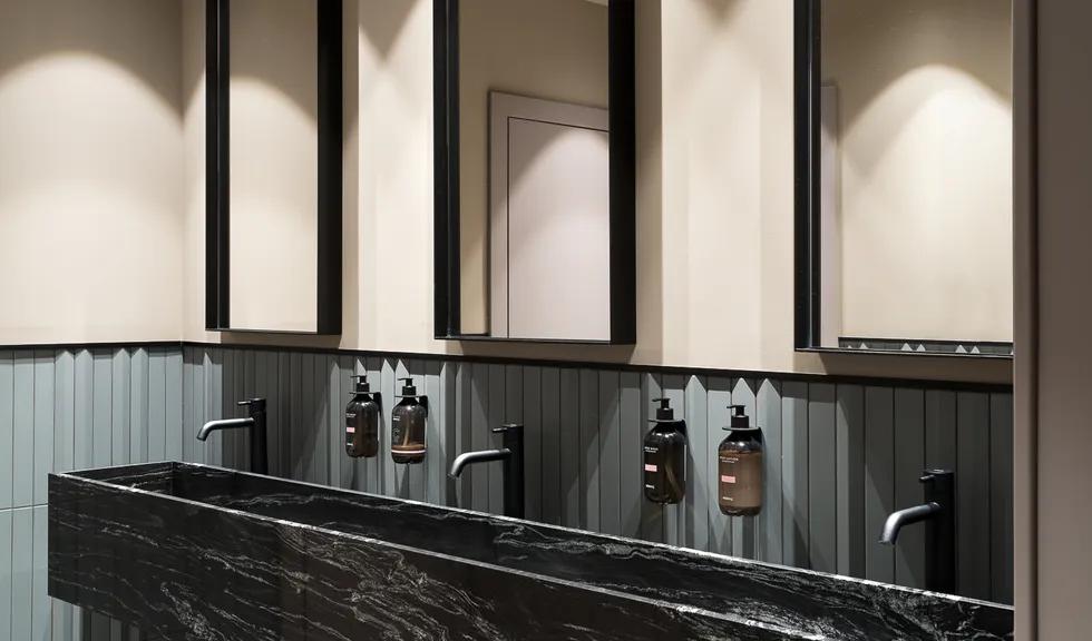 Светильники серии VOLCANO установили в санузлах для акцентного света и достижения необходимого визуального комфорта. В коридорах разместили светильники MAG FLAT, чтобы сделать удобную навигацию для сотрудников и посетителей компании.