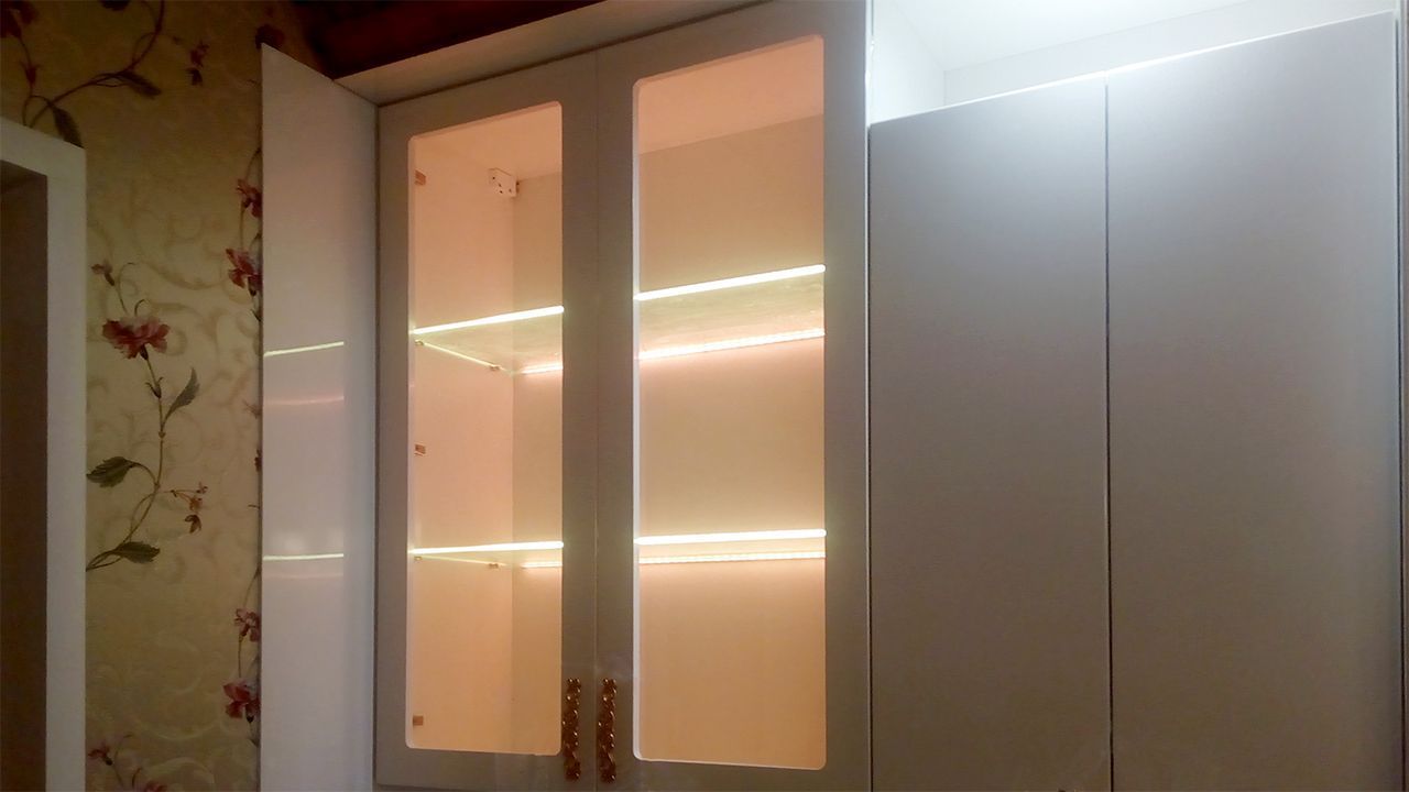 Светодиодная подсветка была установлена для множества стеклянных полок мебели в данной квартире. Были подсвечены стеклянные полки в кухонных шкафах, а также в шкафу в гостиной.