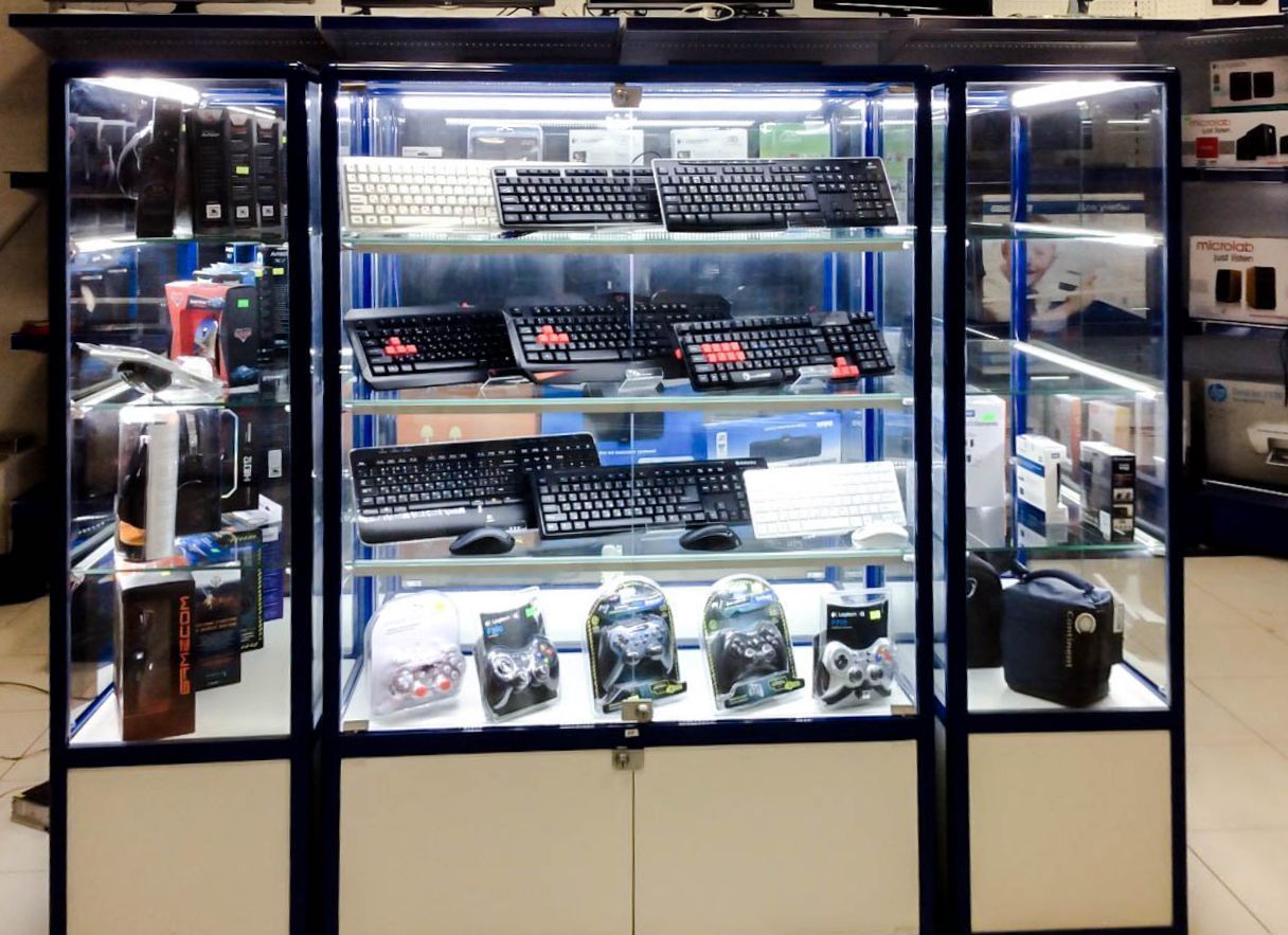 Подсветка стеклянных витрин в компьютерном магазине OLDI.