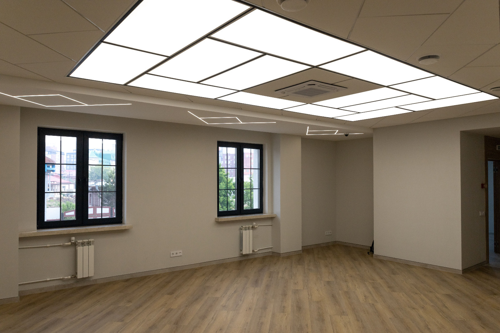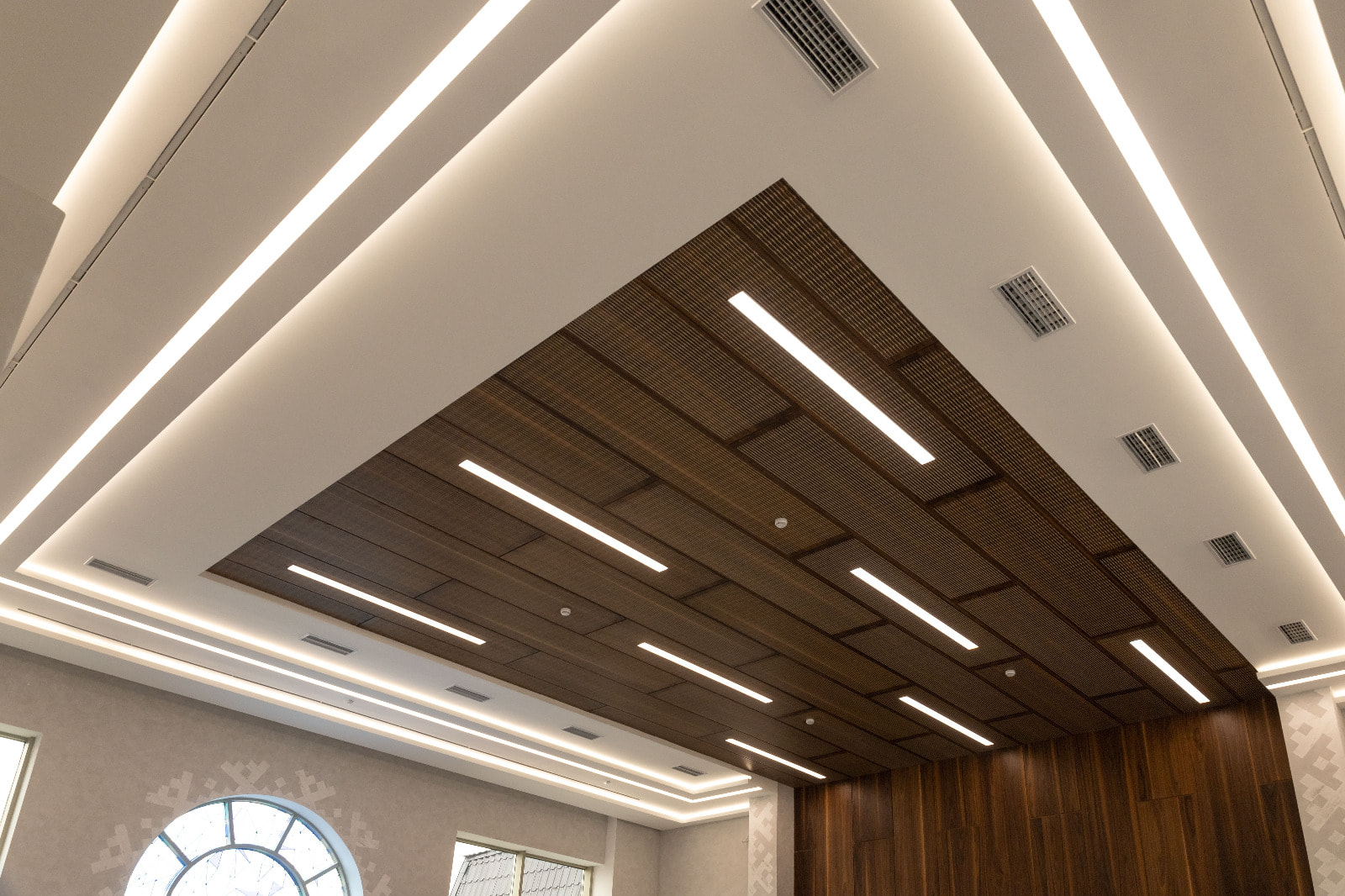 После капитального ремонта интерьер здания представительства ЯНАО стал более стильным, современным и в то же время — респектабельным. Разнообразные линии света — один из основных источников освещения в интерьере. Они не только создают освещение разных типов — от основного до декоративного, — но и повторяют геометрию отделки, тем самым гармонично вписываясь в пространство.