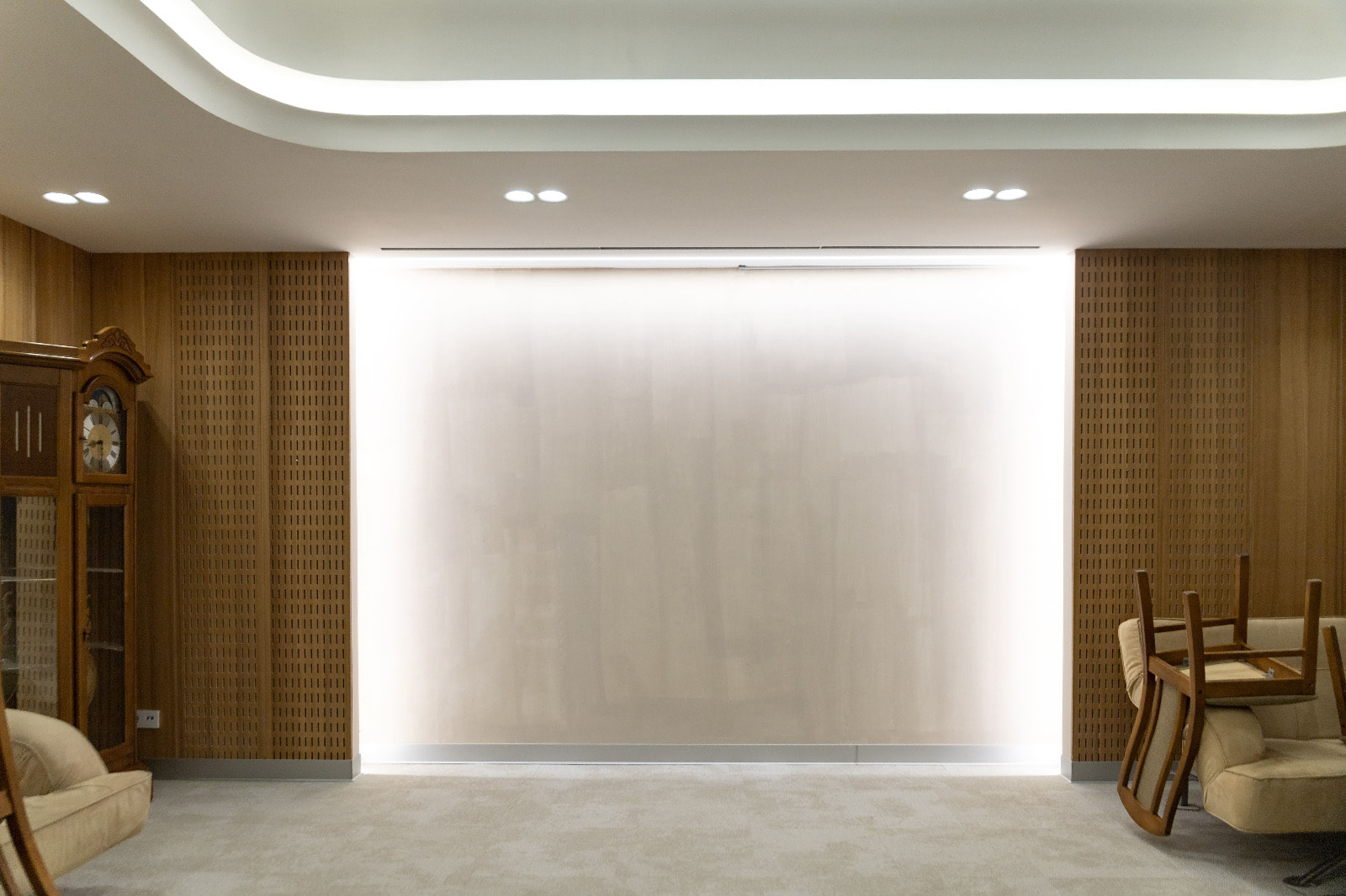 Для данного проекта под заказ были созданы светильники SP LINE на основе профиля разной формы и длины. Прямые линии отлично смотрятся между деревянных реек на потолке и в мраморных панелях, а крупная прямоугольная композиция подчеркивает геометрию комнаты.