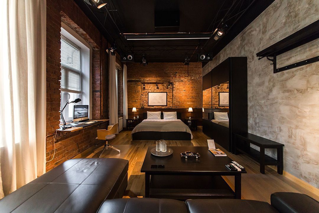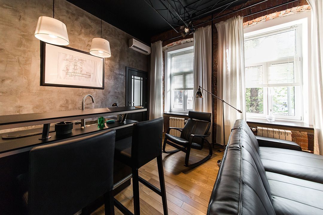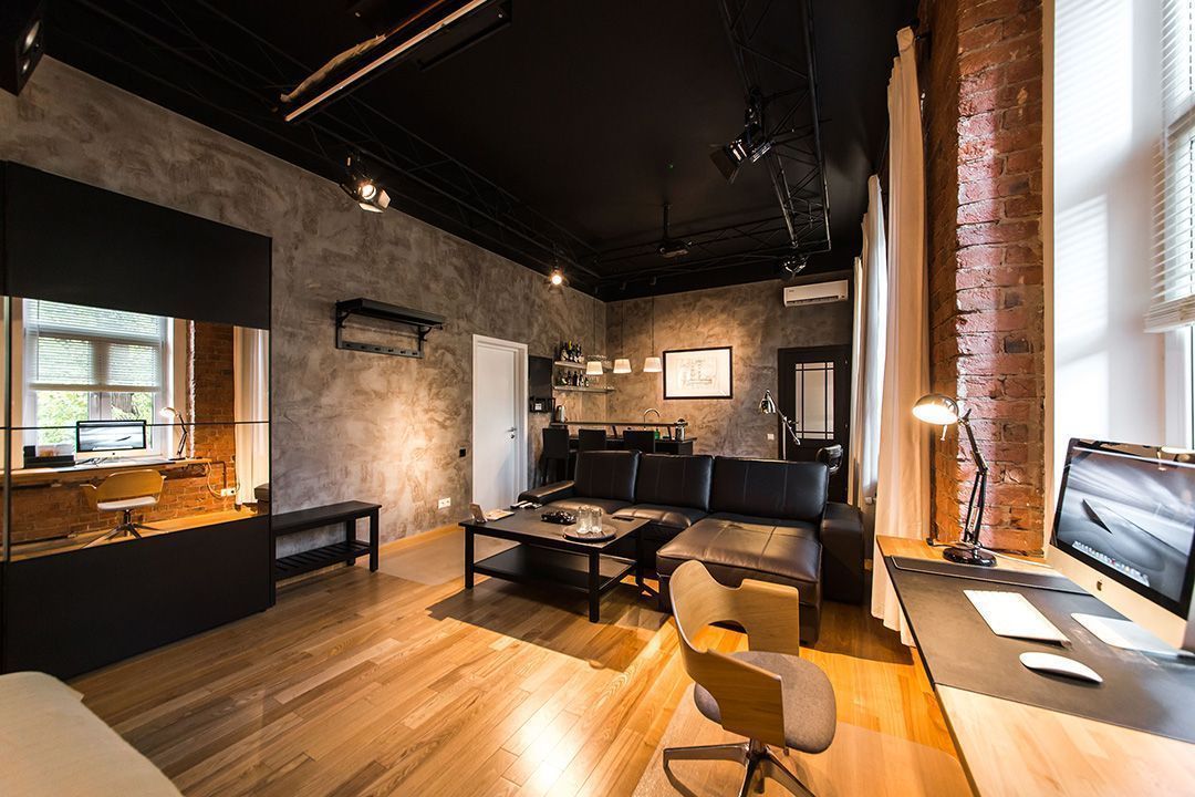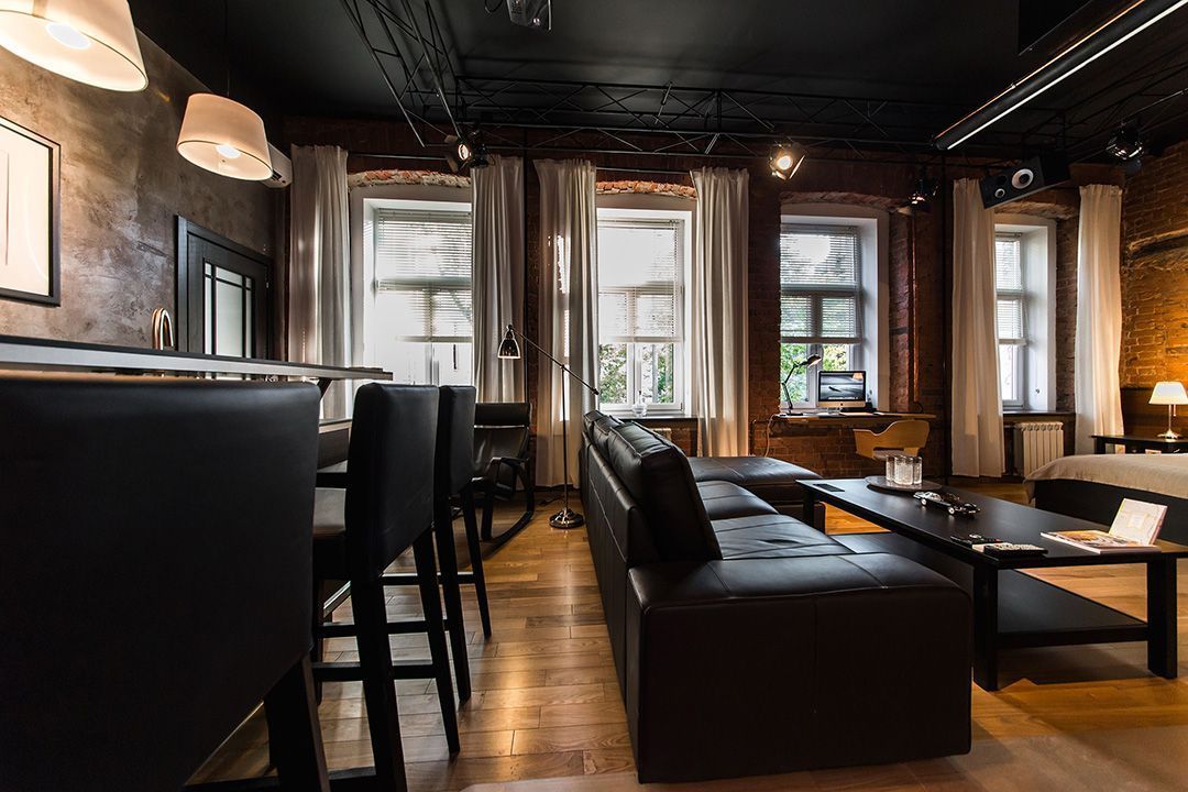 Интерьер московской квартиры-студии выполнили в стиле джазового кафе: кирпичные стены, дерево, обилие кожаной мебели. Особенной деталью этого интерьера стала ферма, установленная под потолком. На ферме подвешены софиты и акустические колонки.