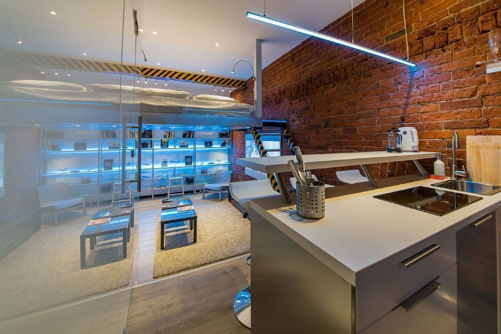 В зоне кухни на тросиках были подвешены линейные светодиодные светильники из алюминиевого профиля и светодиодной ленты RGB. Для подсветки других зон помещения, в частности пола спальной зоны, расположенной на втором уровне студии, была использована синяя светодиодная лента Arlight. Такая подсветка подчеркивает авиационную тематику интерьера, напоминая о голубом небе.
