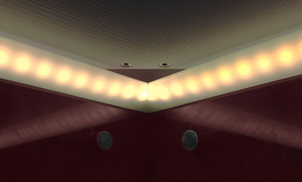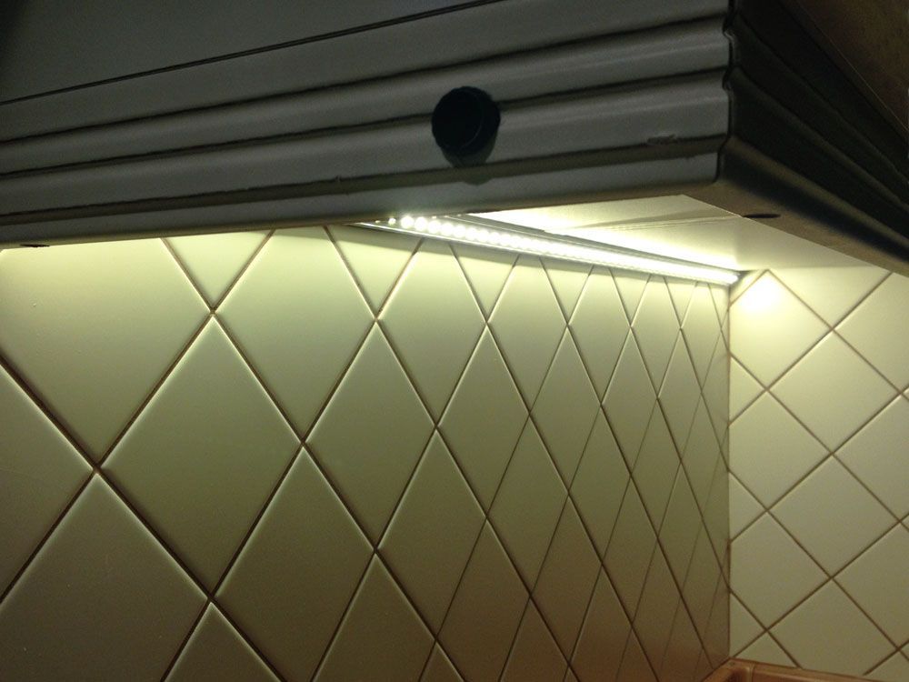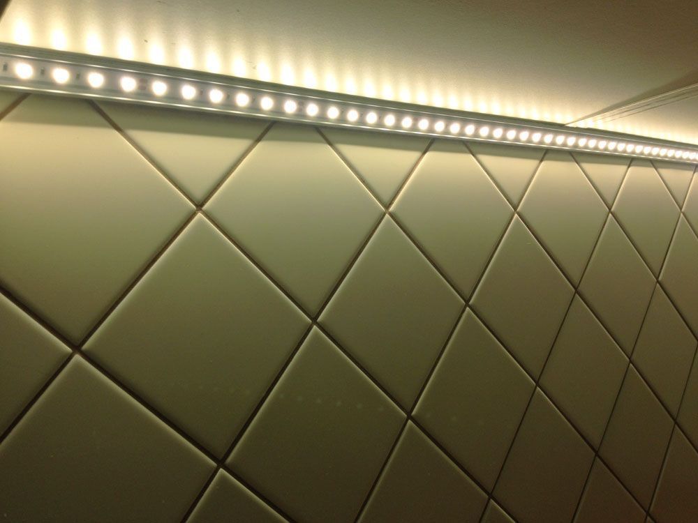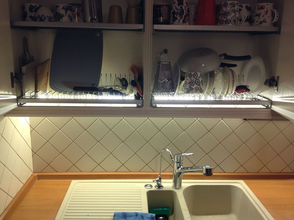 На кухне, приведённой на фотографиях, подсветка была реализована с использованием алюминиевого профиля для светодиодной ленты и, конечно же, самой светодиодной ленты.