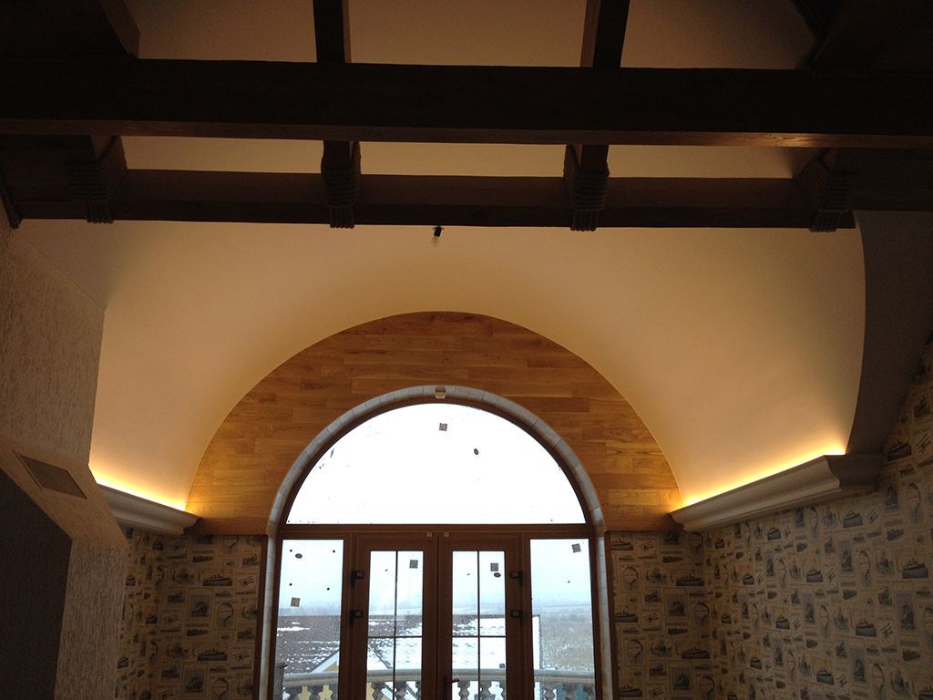 Для подсветки мансарды светодиодная лента тёплого белого свечения была установлена в декоративный карниз, а её свечение направлено вверх, чтобы обеспечить большую освещённость и подчеркнуть свод высокого арочного потолка.